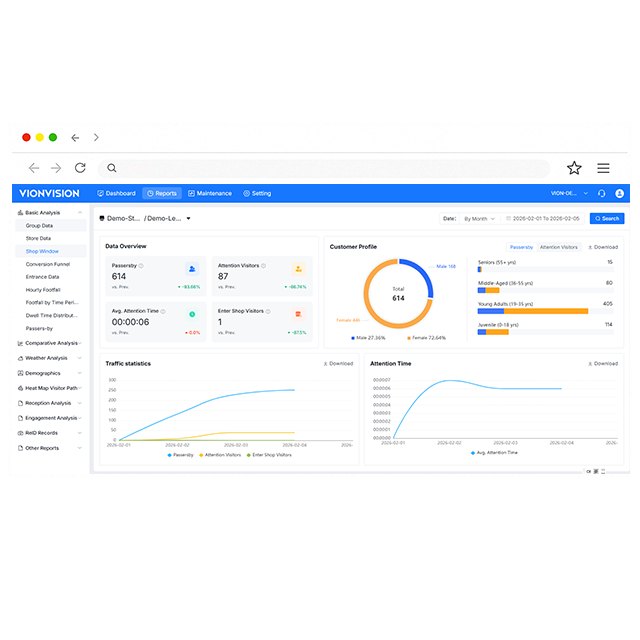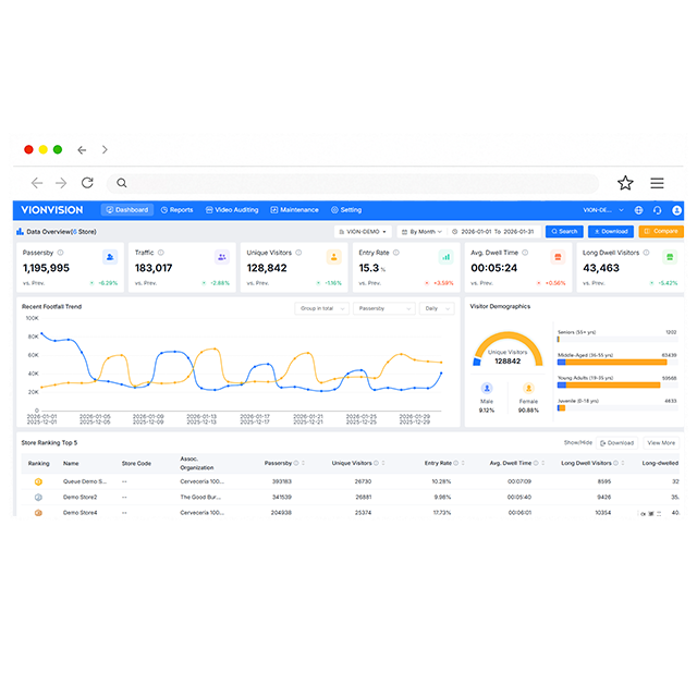 Vstore is a retail-focused data visualization and analytics platform built around footfall and shopper-behavior insights. It provides real-time dashboards & anlysis tools at group and store levels, enabling users to query customer-flow patterns and run statistical comparisons across stores or time periods. Key analytics include dwell time, demographics (age and gender), heatmaps, product engagement, and correlations between performance and store layout. Its core highlight is a graphical end-to-end conversion funnel—from pass-by to entry, deep shopping, product interaction, and purchase—helping managers quickly identify bottlenecks and drive faster optimization cycles (e.g., PDCA/OODA). Built-in active O&M tools also simplify device monitoring and maintenance at scale.