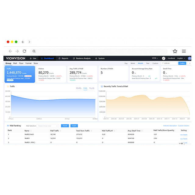 Vmall is a dedicated smart data management platform for plazas & shopping centers, designed to centralize and visualize footfall and shopper-behavior insights across an entire mall group. It provides real-time dashboards and trend reports at multiple levels—including group, plaza, floor, level, and individual store—enabling users to monitor performance across all sites at a glance. Beyond traffic volumes, Vmall delivers deeper behavioral intelligence such as trajectory mapping, heat distribution, dwell-time analysis, and demographic breakdowns (e.g., age and gender). It also supports correlation analysis between industries and stores, enriched with local weather and holiday factors for more contextual insights. By turning data into actionable decisions, Vmall helps optimize leasing strategies, drive traffic to underperforming areas, and evaluate the impact of brand mix or layout adjustments—ultimately improving mall operations and marketing effectiveness.